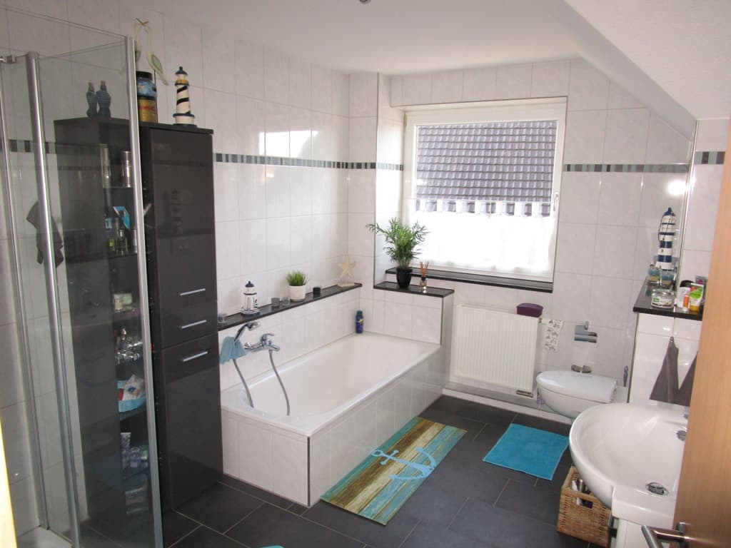 Im Erdgeschoss befindet sich die Küche, ein HWR, das Gäste-WC, die Diele, sowie das große Wohnzimmer mit direktem Zugang zur Terrasse und zum Garten.Im OG befindet sich ein helles Tageslicht-Bad , sowie 2 Schlafzimmer, Ankleideraum und Abstellraum. Das Bad bietet mit einer Dusche, einer Badewanne und einer Fußbodenheizung angenehmen Wohnkomfort.